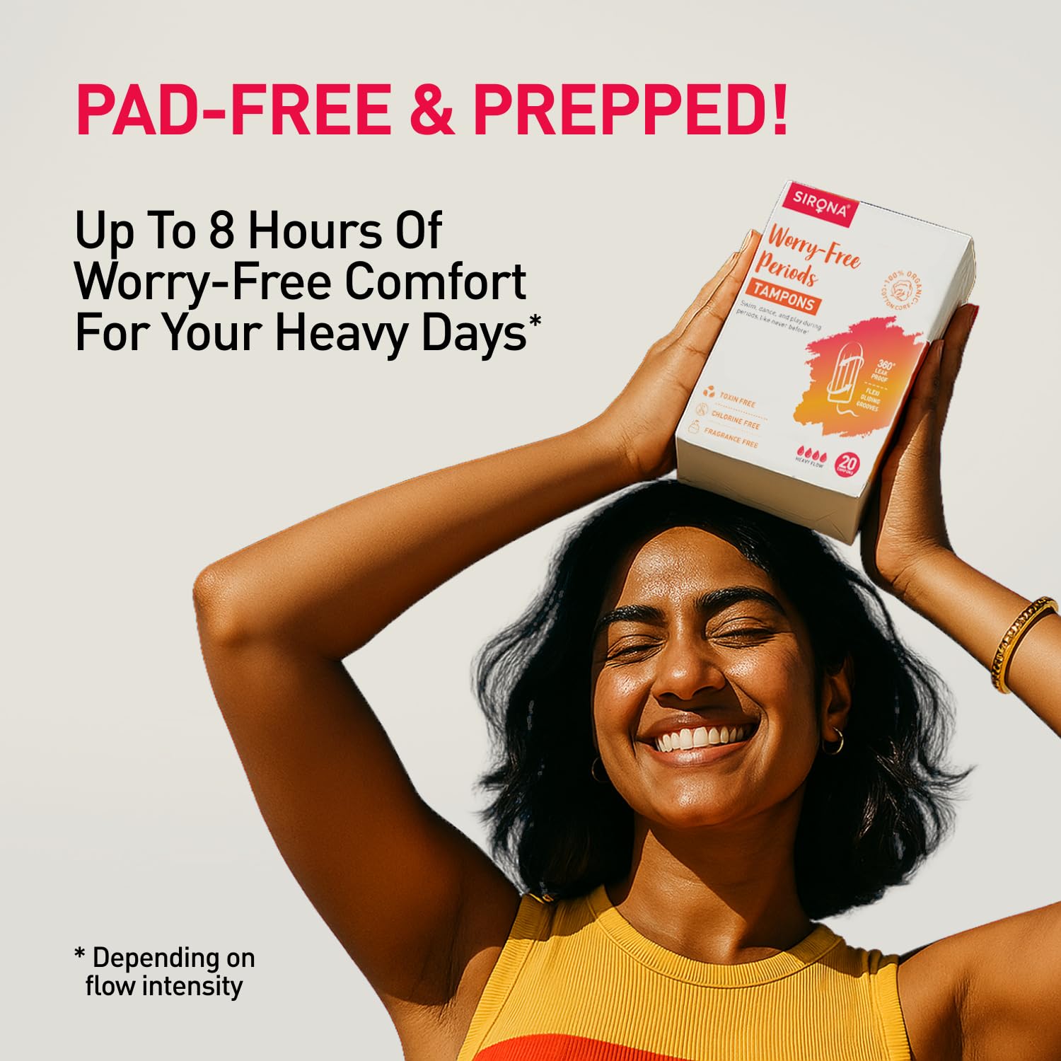 Sirona Period Made Easy Tampons are designed for women who experience heavy menstrual flow and need reliable protection without discomfort. With an ultra-soft fiber build and advanced 360° leakproof technology, these tampons ensure comfort, dryness, and freedom of movement throughout your period. They are biodegradable, chlorine-free, and fragrance-free—making them gentle on sensitive skin. Whether you’re at work, traveling, swimming, or hitting the gym, Sirona tampons give you complete confidence for 4–6 hours.